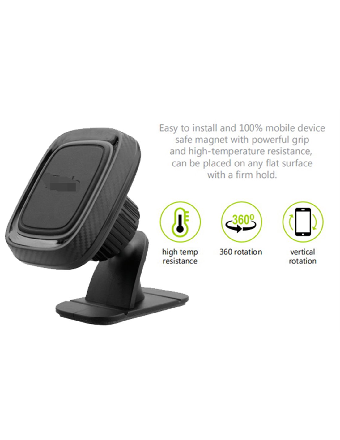 Un suport compact, durabil si usor de fixat ce poate fi lipit pe orice suprafata plata de pe bord. Incorporeaza o serie de magneti puternici ce ofera o fixare stabila in timpul deplasarii. Este prevazut cu un suport cu cap rotativ ce permite o rotatie de 360°. Placuta magnetica poate fi instalata prin lipirea de telefon sau de husa acestuia, cu ajutorul unei benzi sau prin plasarea ei intre husa si telefon. Compatibilitatea universala permite utilizarea suportului cu majoritatea modelelor de telefoane moderne.
